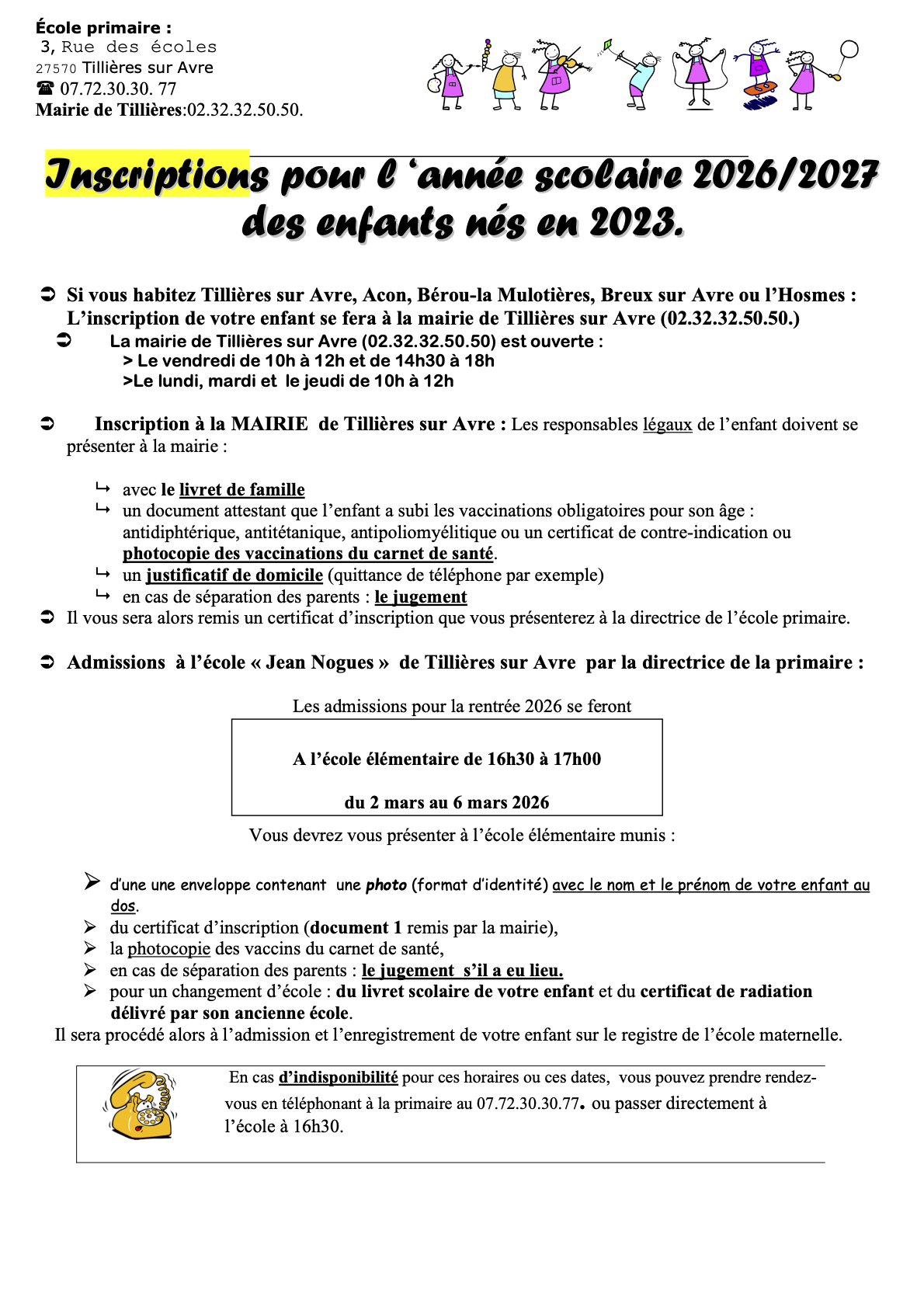 Les inscriptions pour l'année scolaire 2026-2027 des enfants nés en 2023 aux écoles maternelles des Tillières sont ouvertes